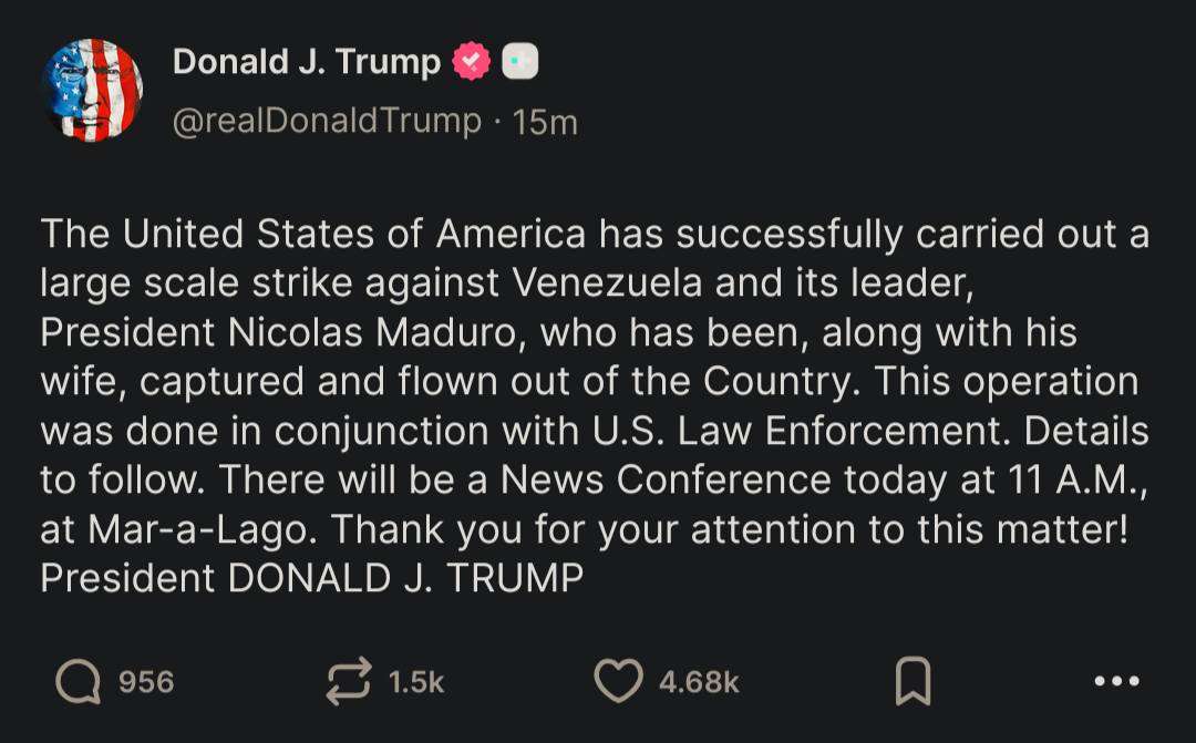 ikt@aussie.zoneEnglish · 14 days agoMaduro has been captured and flown out of the countryaussie.zoneimagemessage-square7linkfedilinkarrow-up1109arrow-down14