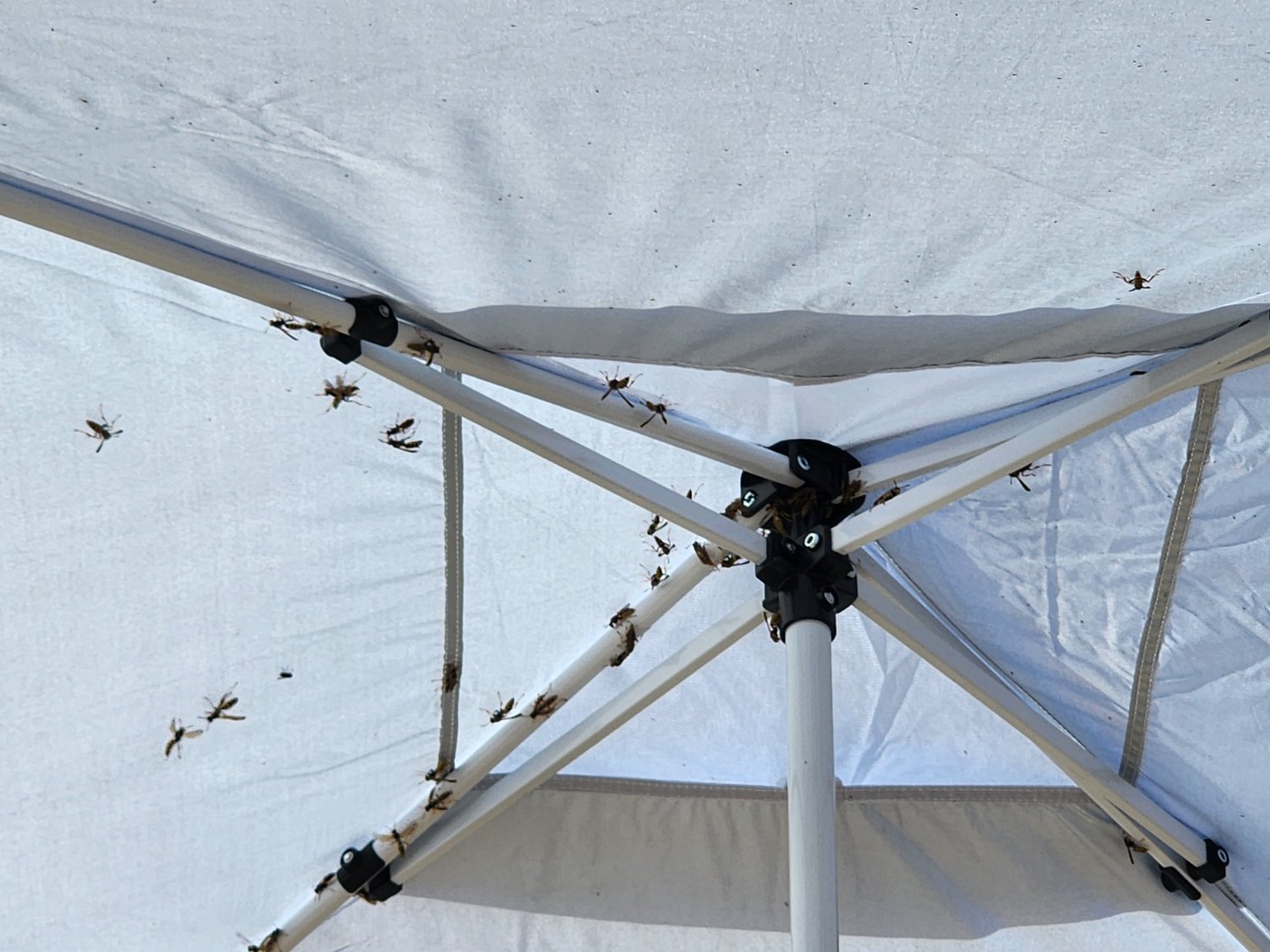 Luckily the next day and during packup it was over cast and cool so they couldn’t fly, but we spent like an hour shaking wasps out from all the poles of the canopy. We easily stomped to death over a hundred wasps that fell out, I’ve never seen anything like it