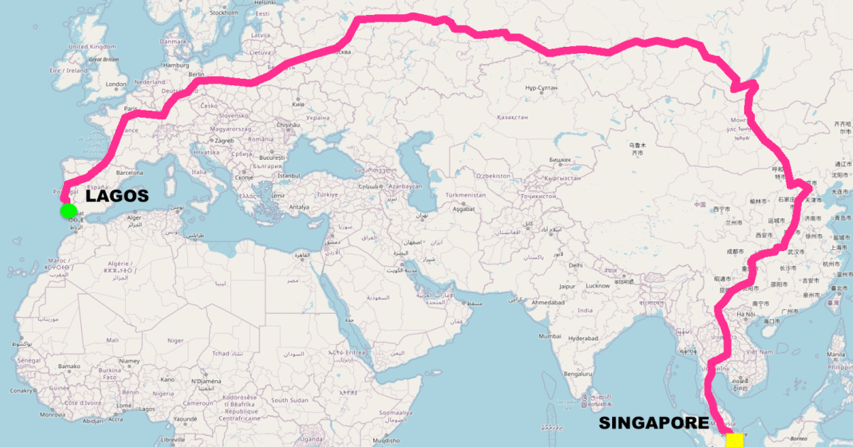 This journey goes across 13 countries, and is 11,654 miles or 18,755 kilometres and takes 14 days assuming no connections are missed.