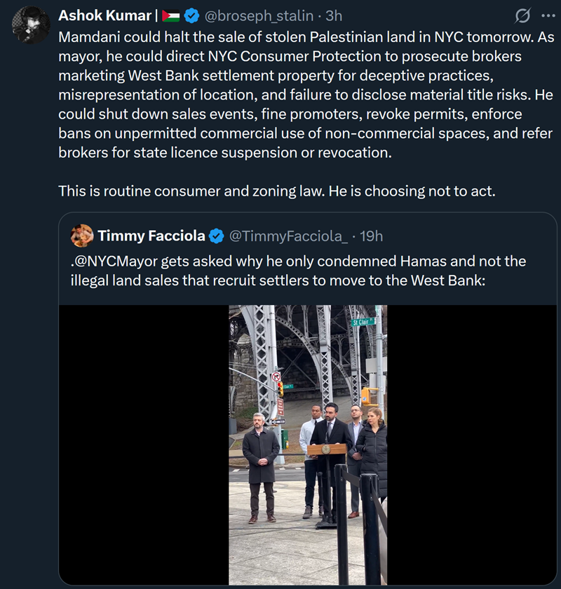 Again people can focus of ton of things at the same time, nobody is distracted. You came here bitching about people not wanting stolen land of people recently evicted to be sold in fucking synagogues in the USA . We are not talking about stolen lands stolen from people that are no longer alive here, those stolen land are from evicted people that are still alive or maybe recently killed by Israel. You can rightfully talk about fighting ice , opposing the kidnapping of Maduro in Venezuela etc but complain about people who talk about all of those things in addition to what happen to the poor Palestinians that you don’t give a damn about, Israel could wipe out Palestine from existence and you will still not budge an inch . Get the hell out of here with your bullshit, scum. If you don’t want me to call you that you should scum being one