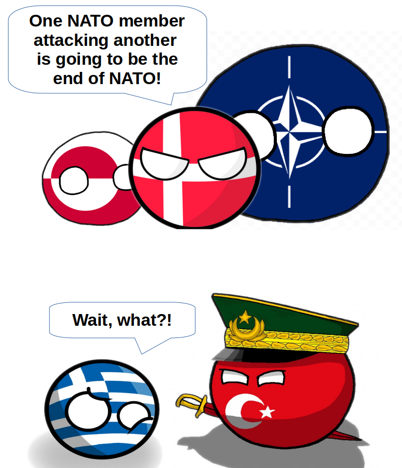 Greenland is a territory of a NATO country, so an attack on Greenland is an attack on NATO.Turkey has a standing, legislated Casus Belli threat against Greece excercising its rights under UNCLOS. It claims “grey zones” in the Aegean and wants to revise the sovereignty of Greek islands, including inhabited ones.