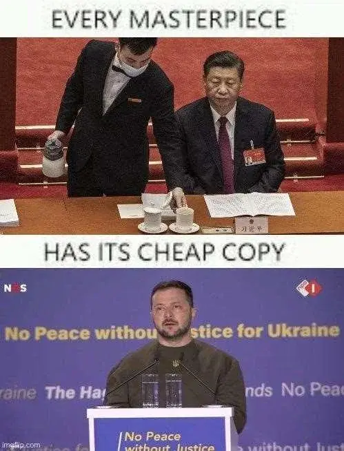 Further investigation revealed that this image was taken at the start of a very long Party meeting, which likely explains why Xi felt the need for two drinks, and that furthermore that it has been expected for Party members in China to pay for their own drinks at these meetings since the days of Mao, so the story was a fairly ridiculous mix of projection, Orientalism, sinophobia, and anti-Chinese propaganda, which the OP is invoking for comedic purposes by comparing it with an image of Zelenskyy with two glasses of water in front of him.
