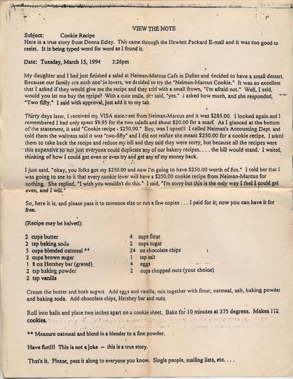 quixoticgourmet@lemmy.worldM to Vintage Recipes - Archiving nostalgic recipes from cookbooks, handwritten notes, advertisements, etc@lemmy.world · 3 years ago[RECIPE] Neiman Marcus Cookie Recipe Chain Letterplus-squarelemmy.worldimagemessage-square2linkfedilinkarrow-up12arrow-down10