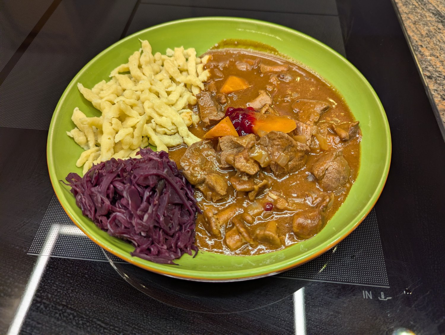 Oh my goodness I would gobble that plate up. All things that I like. Spatzle with something saucy, a little veg to make it a balanced meal. 👌