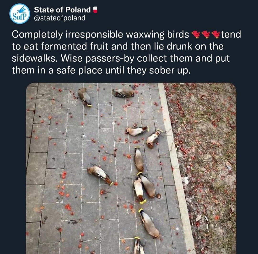 True, I mixed that up after reading the article because I dug into birds and ethanol poisoning and by the time I posted the comment I had forgotten, that the birds from the photo were unrelated to ethanol poisoning.